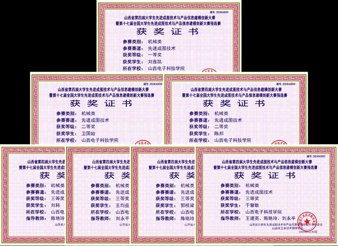 自2024年4月起,在学校的大力支持下,智能制造产业学院组织动员学生进行报名参赛,选拔出19名学生代表我校参加山西省的预选赛,通过晚自习集中培训,最终有7名学生获得省赛各奖项,成功晋级全国总决赛。其中刘鑫凯获得一等奖,卫国励、陈邦获得二等奖,刘科、王均益、郭枝梁、于慧敏获得三等奖。