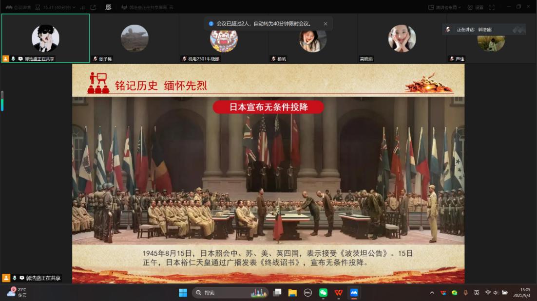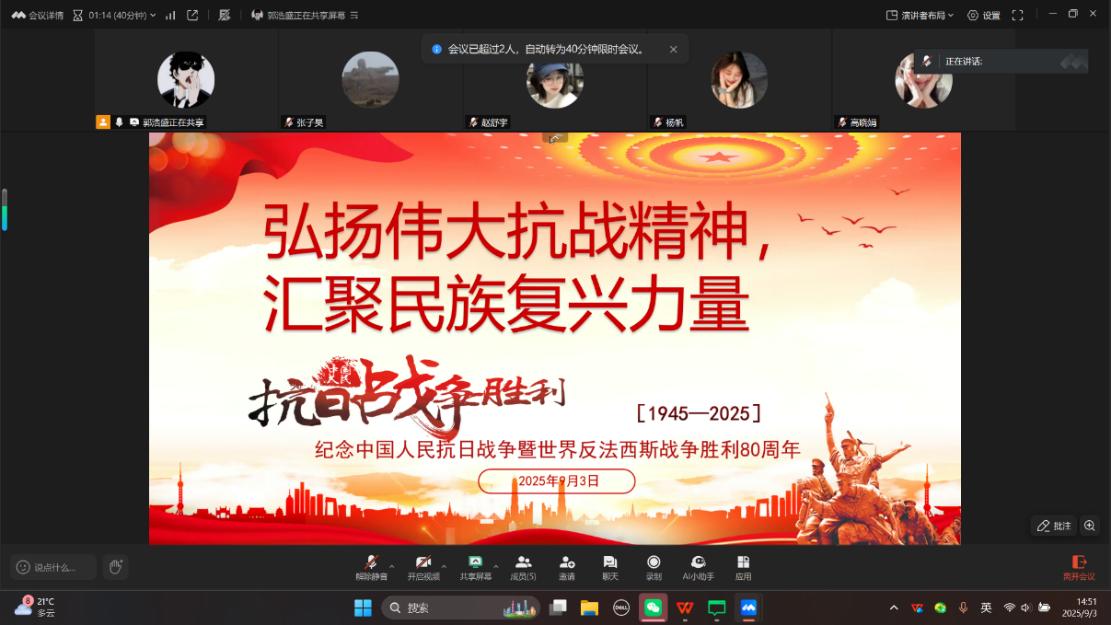 党日活动负责人首先带领全体成员回顾了中国人民抗日战争那段艰苦卓绝的历史,重温了无数革命先辈在民族危亡之际挺身而出、浴血奋战的英勇事迹。在集中学习之后,支部成员共同观看了讲述左权、佟麟阁等抗日将领事迹的纪录片。镜头里,左权将军和佟麟阁将军为了民族存续,甘洒热血、勇赴国难,彰显出的铁血担当与忠勇气节,让党员们深受震撼,纷纷表示要以先辈为范,砥砺初心,勇担使命。伟大的抗战精神,是中国人民弥足珍贵的精神财富,永远是激励中国人民克服一切艰难险阻、为实现中华民族伟大复兴而不懈奋斗的强大精神动力。活动最后,赵春江老师对本次党日活动进行总结发言,告诉同学们要铭记历史、警示未来,传承抗战精神,汲取奋进力量,一起筑牢民族复兴梦,为祖国事业添砖加瓦。