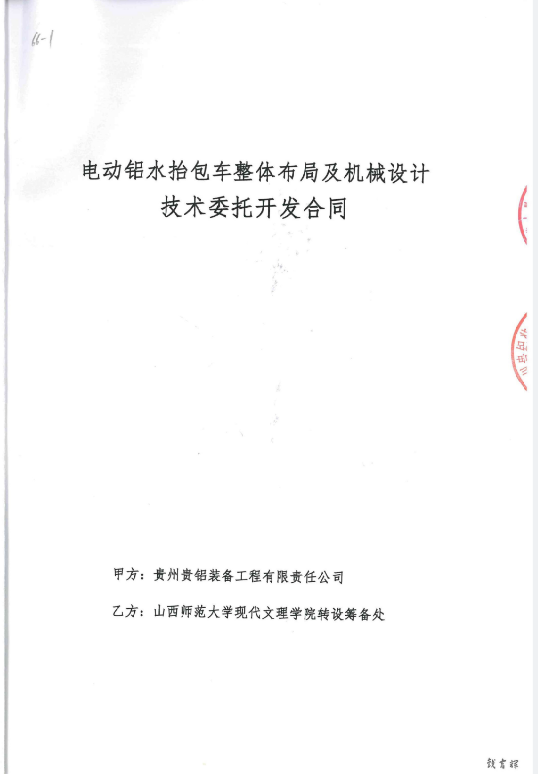 我院与贵州贵铝装备工程有限责任公司签订技术委托开发合同,我院受贵铝装备的委托,开发电动铝水抬包车整体布局及机械设计。