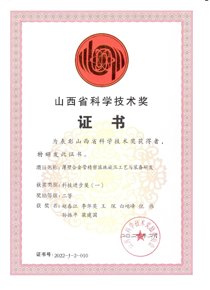 我院赵春江教授获2022年山西省科技进步二等奖。获奖内容属于机械工程和金属材料成形领域,主要科技内容为:高速滚珠旋压接触过程拟动力学建模,大长径比薄壁管滚珠旋压工艺开发与工艺参数优化,旋压模具、装备结构与电液控制系统开发和工艺与装备的集成和现场应用。项目可实现φ3-φ114mm无缝薄壁管的高附加值加工,表面光洁度可达0.6μm;综合成材率提高5%以上,极限壁厚可达0.02-0.05mm,金属晶粒度达8级,机械强度提高50%以上,双向机械性能均匀。项目获得相关的国家发明专利12项,软件著作权3项,发表SCI及高水平论文20余篇;培养博士3名,硕士8名。